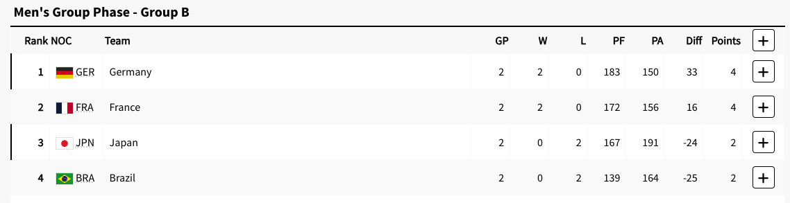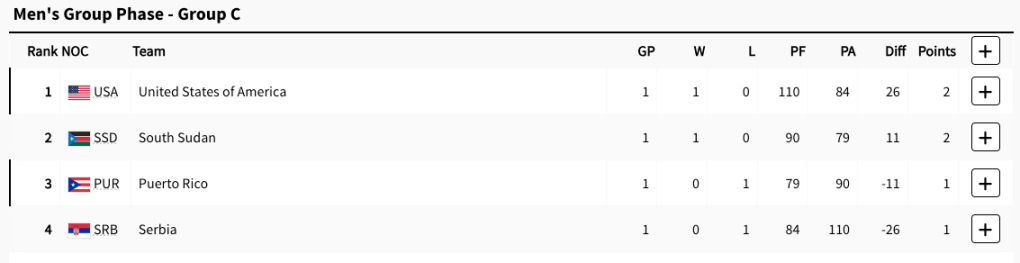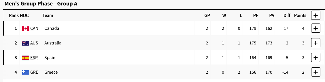 In the men’s standings, Canada lead Group A. Germany lead Group B. The United States lead Group C. Australia, France, and South Sudan are in positions to clinch knockout stage spots. Spain and Japan are in positions to advance as the top two third place teams.