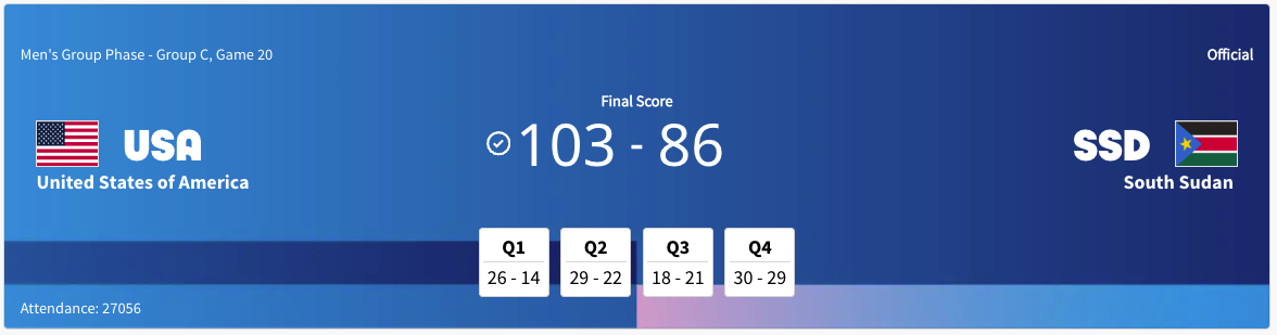 The United States were coming off of a 110-84 victory over Serbia. The United States were 1-0-0 so far in this tournament. The United States were second in Group C. South Sudan were coming off of a 90-79 win over Puerto Rico. South Sudan had a record of 1-0-0. They were third in Group C. This game was a rematch of a Paris 2024 warm up match. The United States only beat South Sudan by one point in their last meeting. South Sudan led at halftime of their last meeting. That was a warm up match. There are lots of talent on both sides. The United States was looking to control this game. The likely to come out playing more aggressively than they did in their last meeting. I was doubtful that the United States would allow South Sudan to come as close to winning as they did last time.