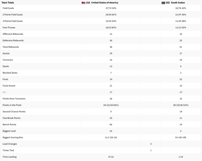 The United States lead the field goals with a 53% conversion rate. They went 37 for 70. The United States went 43% for three pointers. They went 80% on free throws. South Sudan had the better free throw percentage at 92%. South Sudan got six more offensive rebounds than the United States. The United States led in defensive rebounds, South Sudan lead in total rebounds. The United States led in assists. The South Sudan led in turnovers. The United States led in steals. The South Sudan had more fouls. The United States let South Sudan score fifteen points on turnovers.