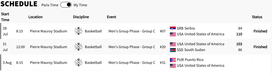 The United States take on Puerto Rico for their final game of the group stage. That game will be on Saturday, August 3rd, 2024. Tip off is scheduled for 8:15 am PST. That game will be at Pierre Mauroy Stadium. A win would secure the top spot in Group C for the United States.