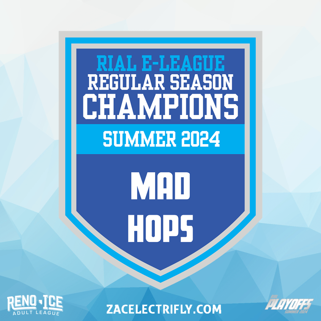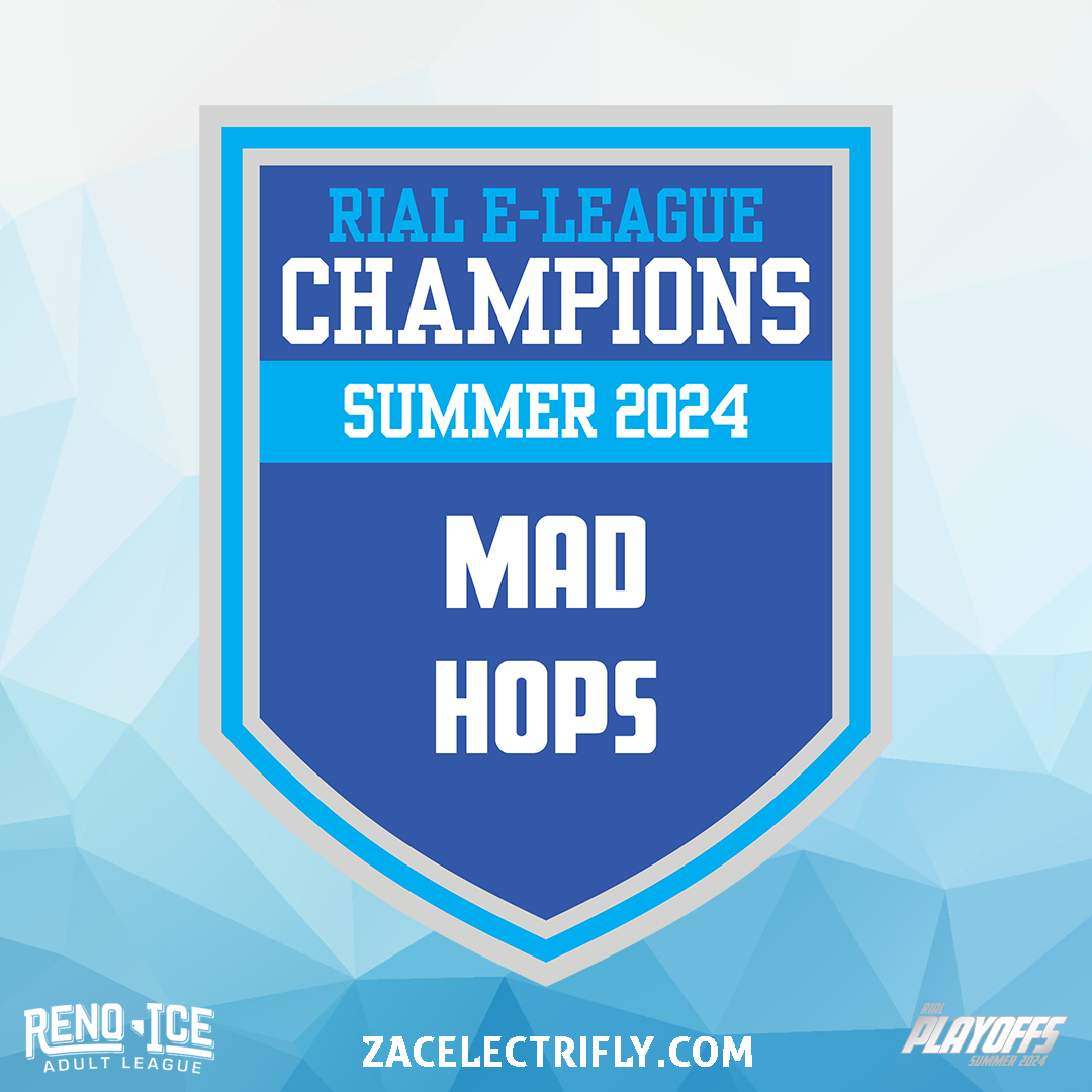 Mad Hops are the RIAL Summer 2024 E-League Champions. This is their second RIAL E-League Championship. This is their first win since they changed their name from Long Drink to Mad Hops. They also won the RIAL Fall 2023 E-League Championship. Mad Hops beat Reno Pond Hockey 6-4 in the RIAL Summer 2024 E-League Championship game.