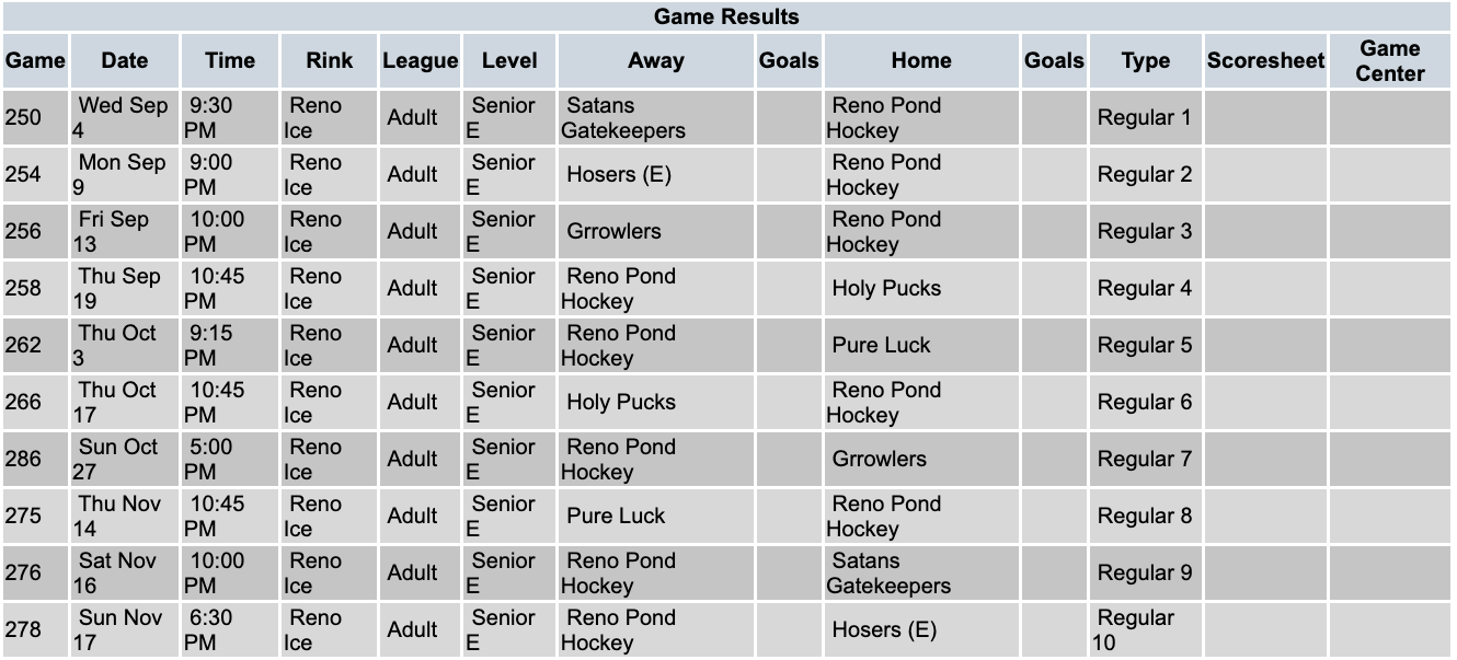 Again the regular season will be a ten game regular season schedule. Reno Pond Hockey has four games in September, three games in October, and three games in November. The RIAL Fall 2024 E-League Playoffs start on Monday, November 18th, 2024. Reno Pond Hockey only has two games this season that start at or before 9:00 PM. Reno Pond Hockey has five games that start after 10:00 PM. The earliest start time is 5:00 PM. The latest start time is 10:45 PM.