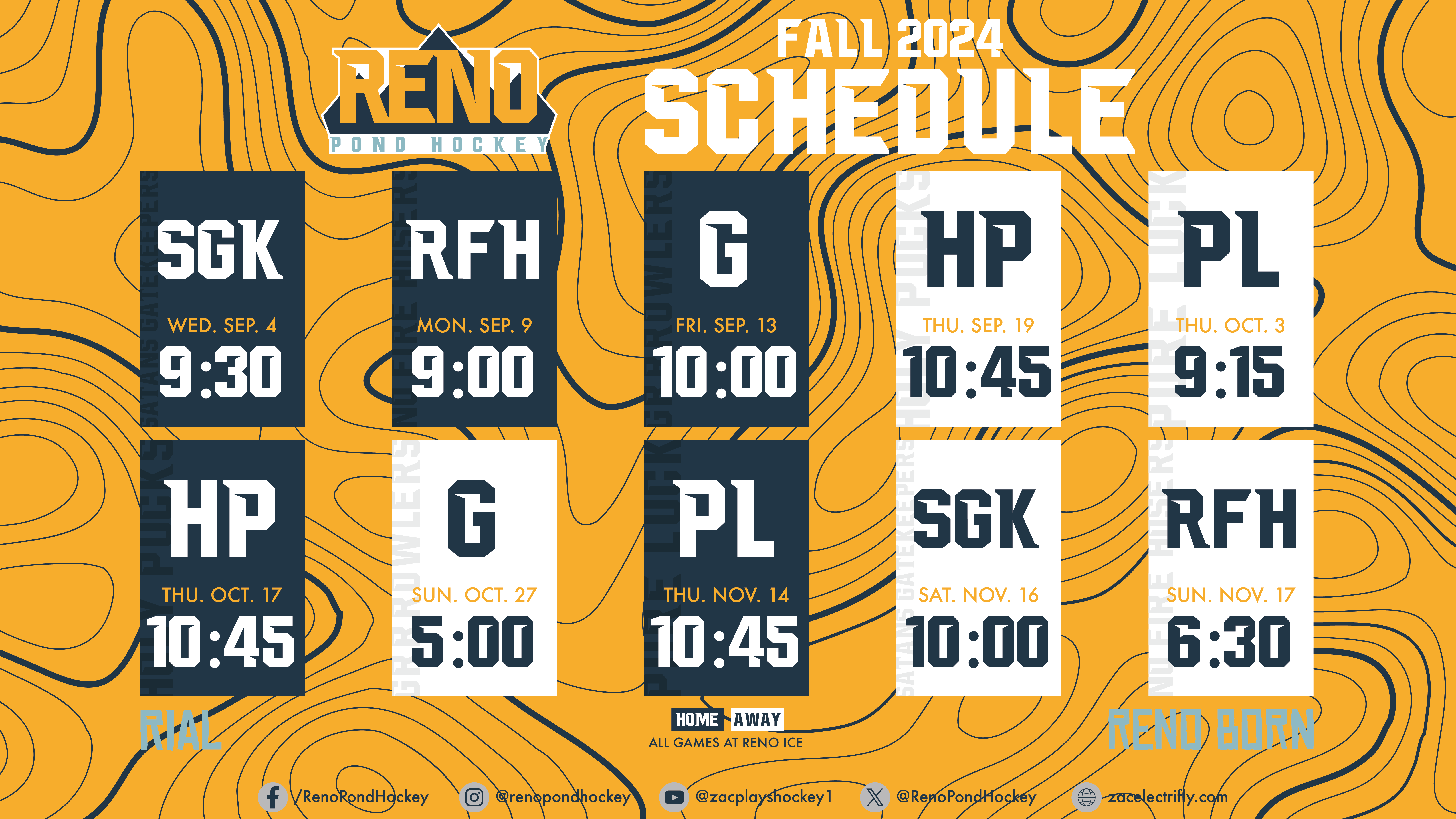 The Reno Pond Hockey schedule for the Reno Ice Adult League Fall 2024 season is out now. You can check out the schedule here. In this post, there is a printable schedule that can be printed or used as a digital wallpaper. There is also a mobile schedule that can be used as a wallpaper for cell phones. There is also a downloadable schedule that can be added to your calendar on your devices.