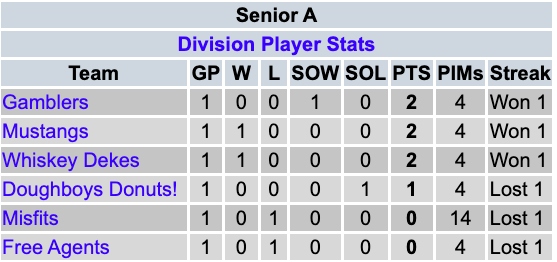 Whiskey Dekes now lead the A-League power rankings. They lead after winning their opening game. The Reno Gamblers are second in the power rankings. They moved up after winning their first game in a shootout. The Mustangs are third in the power rankings. They moved up after winning their first game. The Doughboys Donuts! are fourth in the power rankings. They moved down after a shootout loss. The Misfits are still in the fifth spot after losing their first game. The Free Agents are still last in the power rankings after losing their first game.