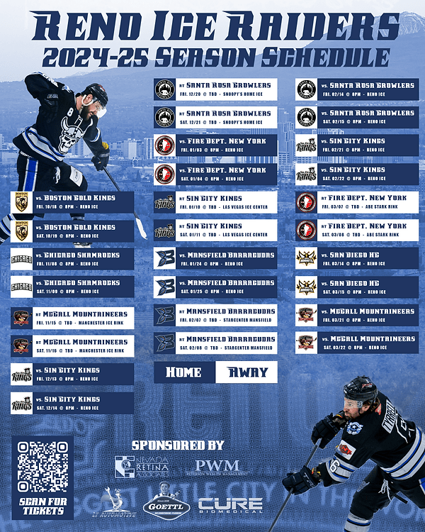 The Reno Ice Raiders will be playing twenty eight games for the 2024-25 season. That is the same amount of games they played last season which was the most by far in the Mountain Hockey League. The Ice Raiders will be playing eighteen home games and only ten away games. They are playing two less home games then they did last season. All of the Reno Ice Raiders games are on Fridays and Saturdays. The season starts on Friday, October 18th, 2024 against the Boston Gold Kings. The regular season will come to and end on Saturday, March 23rd against the McCall Mountaineers. The postseason will start on Friday, April 18th, 2025. That is according to the Reno Ice Raiders website. The Cops vs Fire Fighters exhibition game will be on Saturday, October 12th, 2024. The United States vs Canada exhibition game dubbed the “U.S Eh! Classic” will be on Saturday, April 5th, 2025.