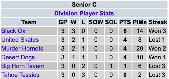 Black Ox continue to lead the C-League power rankings. They remain undefeated after winning back to back games to start the season. The United Skates are second in the power rankings. They were undefeated going into week three after back to back wins to start the season. The Desert Dogs are third in the power rankings. they moved down after a loss. The Murder Hornets are fourth in the power rankings. They moved up after back to back wins in week two. Big Horn Tavern moved down after back to back losses. The Tahoe Tessies are last in the power rankings after starting the season with three straight losses.