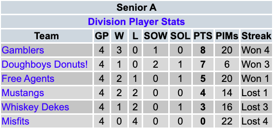 The Reno Gamblers continue to lead the A-League power rankings. The remain undefeated after winning their week four game. The Doughboys Donuts! are second in the power rankings. They won their week four game in a shootout to remain undefeated during regulation. The Free Agents are third in the power rankings. They won their week four game. The Mustangs are fourth in the power rankings. They lost their week four game to a top three team. Whiskey Dekes did not move after a shootout loss. The Misfits continue to be last in the power rankings as they remain the only RIAL A-League team without a win. In the RIAL A-League each game result was where it needed to be in week four to keep the power rankings the same.