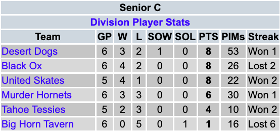 The United Skates now lead the RIAL C-League power rankings. They lead after back to back wins in week four. Black Ox are second in the power rankings. They moved down after a win and a loss in week four. They were the last undefeated team in the RIAL C-League. No there are no undefeated teams left in the RIAL C-League. The Desert Dogs are third in the power rankings. They moved down after a loss. The Tahoe Tessies are fourth in the power rankings. They moved up after a win. The Murder Hornets moved down after a loss. Big Horn Tavern are last in the power rankings as the only remaining C-League team without a win so far this season.