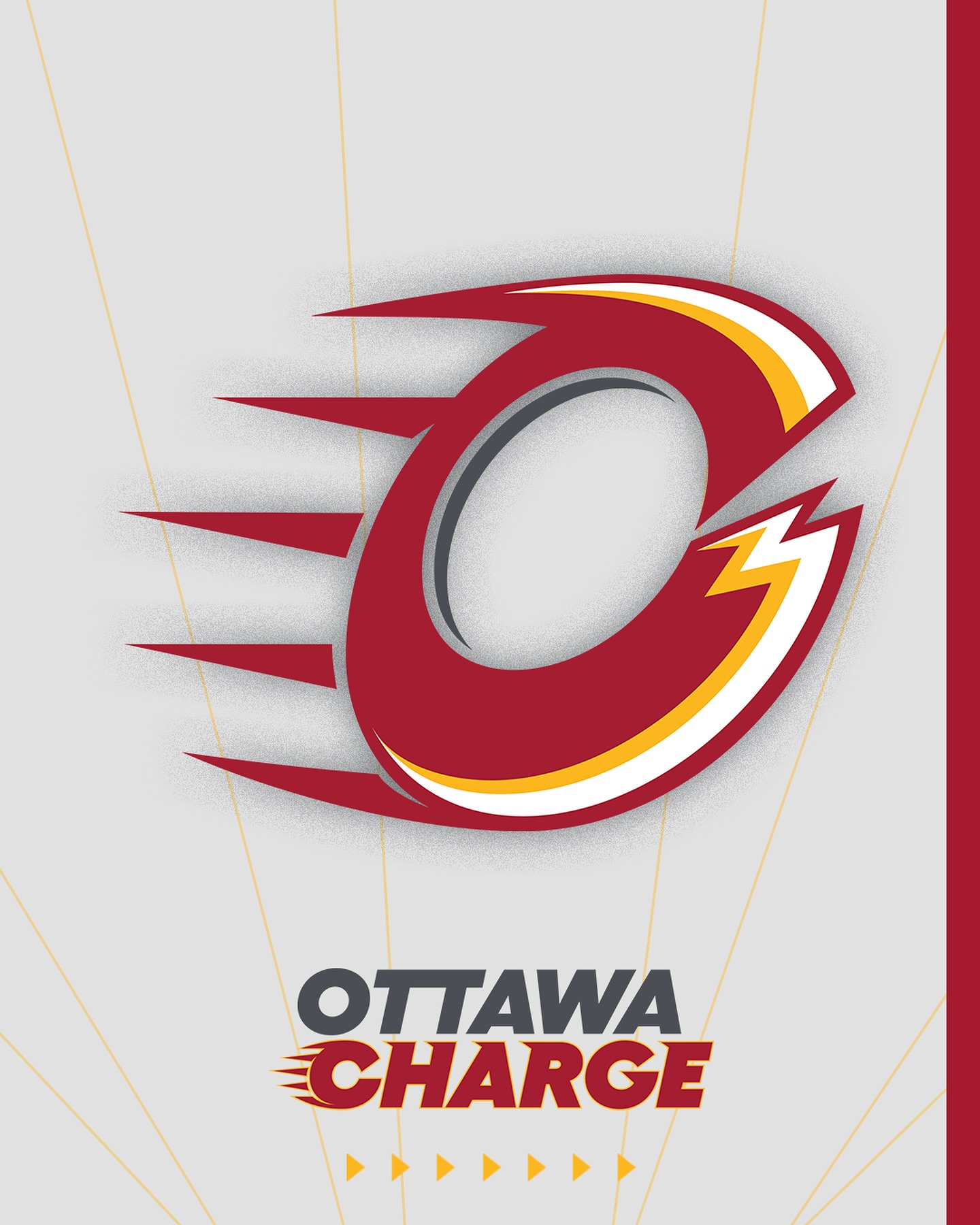 The Ottawa Charge logo is a C. The logo is representing electrifying power. The logo also represents speed and power. The inside is an O for Ottawa. The outside is a C for Charge. It is an effective use of negative space. Again it is another letter logo. This logo is controversial as it looks very similar to the Calgary Flames logo. That is the first thing I thought of when I saw it. It would fit perfectly as a Calgary Flames minor league team. Their colors are red, gold, white, and storm. Their colors match other local hockey teams such as the Ottawa 67s of the OHL and the Ottawa Senators of the NHL. Those are the same colors they used last season except they added gold.
