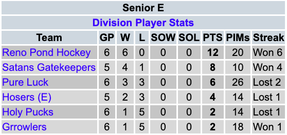 Reno Pond Hockey continue to lead the E-League power rankings. They remain the only undefeated RIAL E-League team left this season after winning their week rescheduled game. Satan’s Gatekeepers are second in the power rankings. They moved up after not playing in week six. Pure Luck are third in the power rankings. They moved down after a loss. The Reno Fire Hosers E are fourth in the power rankings. They did not play in week six. The Holy Pucks remain in the fifth spot after not playing in week six. The Grrrowlers remain in last in the RIAL D-League power rankings after not playing in week six. The Grrrowlers were still without a win heading into week seven.
