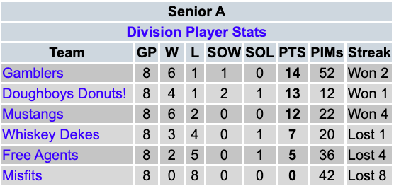 The Reno Gamblers now lead the A-League power rankings. They won their last two games. The Mustangs are second in the power rankings. They won their last four games. The Doughboys Donuts! are third in the power rankings. They won their last game. Whiskey Dekes are fourth in the power rankings. They lost their last game. The Free Agents are fifth in the power rankings. They lost their last four games. The Misfits are last in the power rankings. They have not won a game yet this season.