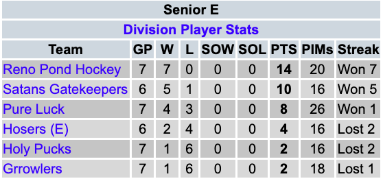 Reno Pond Hockey still lead the E-League power rankings. The are the only remaining undefeated team in the RIAL this season. They have won seven games in a row. Satan’s Gatekeepers are second in the power rankings. They have won their last five games. Pure Luck are third in the power rankings. They won their last game and got the first shutout in the RIAL this season. The Reno Fire Hosers E are fourth in the power rankings. They lost their last two games. The Grrrowlers are fifth in the power rankings. They won their first game of the season in week seven. The Holy Pucks are last in the power rankings. They lost their last two games.