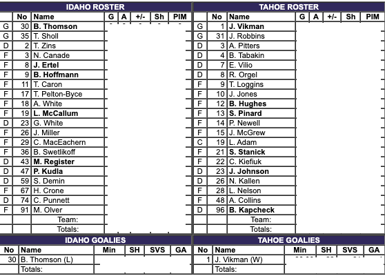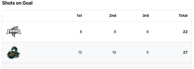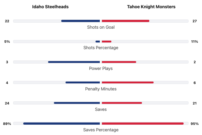 The Tahoe Knight Monsters had five more shots. This is the third game in a row that the Knight Monsters have outshot their opponents. The Knight Monsters had the better shot percentage. The Idaho Steelheads gave up two more powerplays. The Knight Monsters had two more penalty minutes. Vikman had 21 saves for a 95% save percentage for the Knight Monsters. Thomson made 24 saves for a 89% save percentage for the Steelheads.
