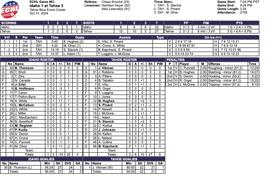 The Idaho Steelheads played more games. The Steelheads had more wins. The Tahoe Knight Monsters had a better record as they are undefeated in regulation. The Steelheads scored 12 more goals. The Steelheads allowed 7 more goals. The Steelheads had the better goal differential. The Steelheads had more points. The Knight Monsters had 49 penalty minutes. The Steelheads had 59 penalty minutes. I thought this game would be a good challenge for the Tahoe Knight Monsters early in the season. I expected some physical play. Not a lot. As this three game home stand goes on I expect the physical play to amp up more and more.