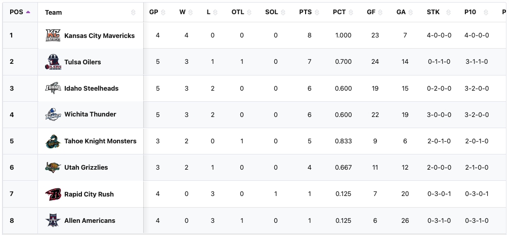 Tahoe Knight Monsters are now fifth in ECHL Western Conference Mountain Division. They are not in a playoff spot. They are one point (an overtime or shootout loss) out of a playoff spot. They are three points (a win and an overtime or shootout loss) away from the top spot in the division. They are one of now only two ECHL Western Conference Mountain Division teams without a regulation loss. They do have the second highest points percentage in the division right now.