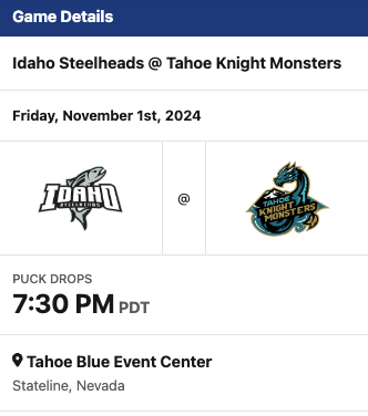 The Tahoe Knight Monsters took on the Idaho Steelheads last night. It was Halloween night. Puck drop was at 7:00 PM. The game was at the Tahoe Blue Events Center. It was the third game of the season. The Tahoe Knight Monsters are the Vegas Golden Knights ECHL affiliate. They were coming off of a 3-1 victory over the Jacksonville Icemen. The Tahoe Knight Monsters had a record of 1-0-1 going into the game. They were undefeated in regulation. They were in 34th place in the ECHL. They were 10th in the Western Conference and 6th in the Mountain Division. The Idaho Steelheads are the ECHL affiliate of the Dallas Stars. The Steelheads played four games. The Steelheads were coming off of a 2-5 loss to the Toledo Walleye. The Steelheads had a record of 3-2-0 going into the game. The Steelheads were in 11th place in the ECHL. They were in 11th place in the Western Conference and 3rd place in the Mountain Division.