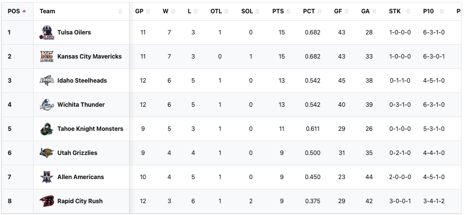 The Tahoe Knight Monsters now have a record of 5-3-1 with 11 points in 9 games. The Knight Monsters are now in 18th place in ECHL. They are in 9th place in the ECHL Western Conference. They are still in 5th place in the ECHL Western Conference Mountain Division. They are two points away from the last playoff spot. They are still four points away from the top spot in the division. They have the 3rd highest points percentage in the division.