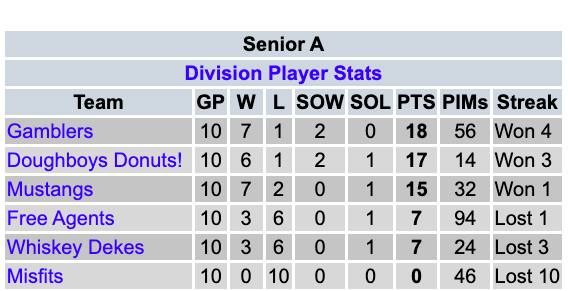 In the RIAL A-League The Reno Gamblers, the defending champions Doughboys Donuts!, and the Mustangs have secured playoff spots. The Free Agents will also be advancing. I think this is their first time in the playoffs. The Misfits and Whiskey Dekes have been eliminated from playoff contention.