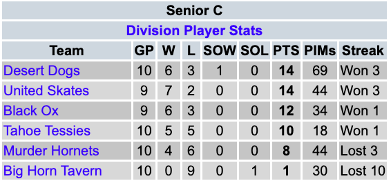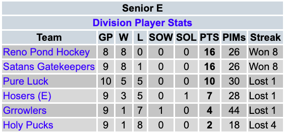 Reno Pond Hockey will take on Satan’s Gatekeepers tonight. That game will likely determine first place. Both teams are tied right now with sixteen points (eight wins). If Satan’s Gatekeepers win, they will be in first place by two points. Reno Pond Hockey still have one game tomorrow. If they win tomorrows game they could win first place on tie breakers. If Reno Pond Hockey win tonight, they will secure first place. Pure Luck will finish the season in third place no matter what. The Reno Fire Hosers E will finish the season in fourth place no matter what.