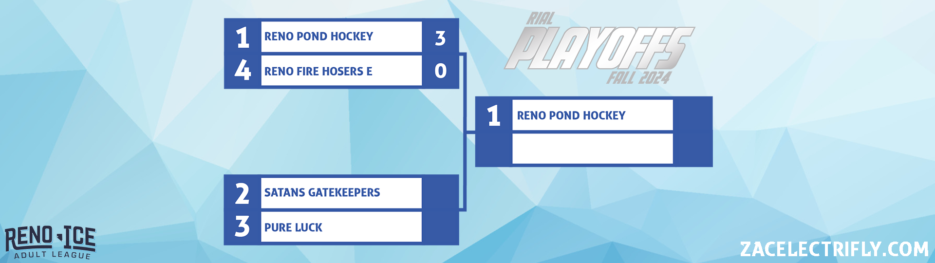 The Reno Ice Adult League Fall 2024 playoffs continued last night. The RIAL E-League Fall 2024 Semifinals started last night. The number one seed Reno Pond Hockey played the number four seed Reno Fire Hosers E. The RIAL FALL 2024 Playoffs will continue on Thursday. RIAL Fall 2024 Championship Sunday is on Sunday, November 24th.