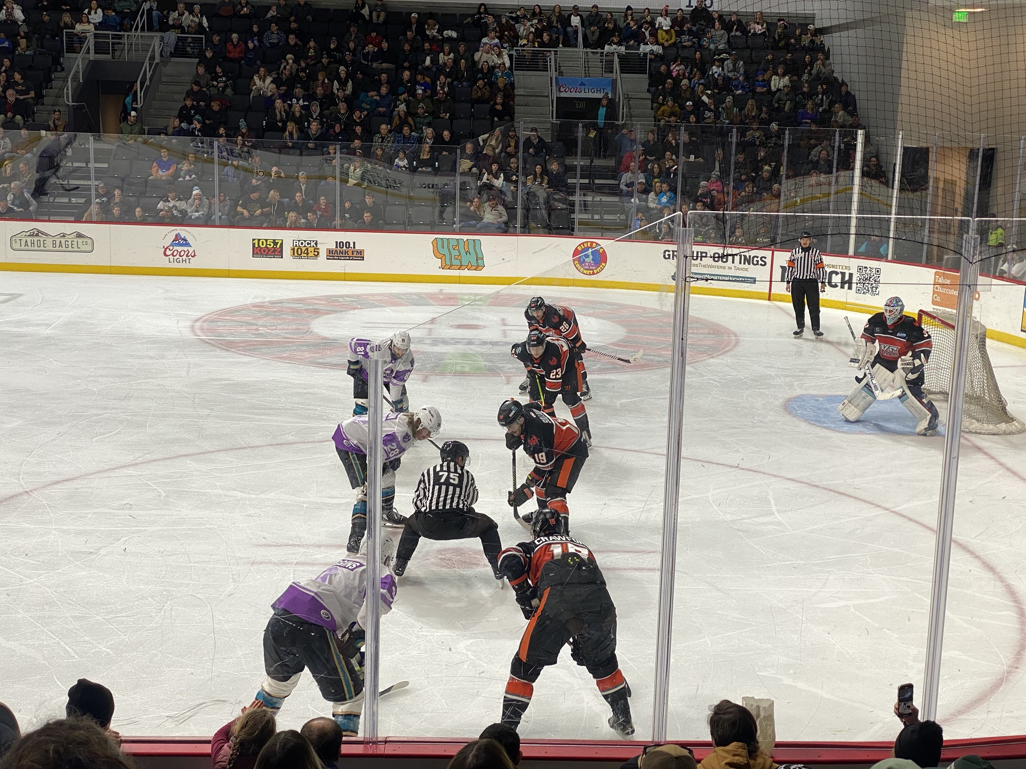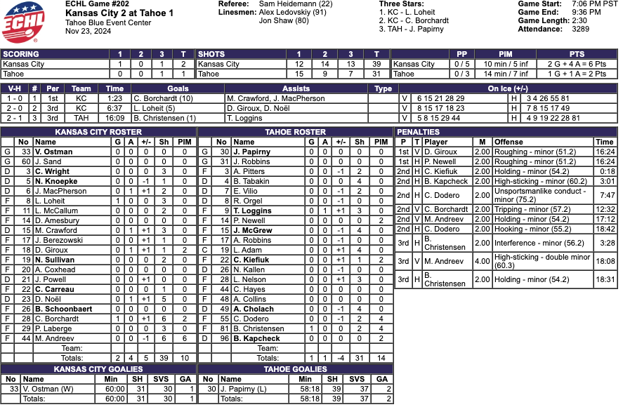 #30 Jordan Papirny was in net for the Tahoe Knight Monsters. This was his sixth start of the season for the Tahoe Knight Monsters. The Tahoe Knight Monsters placed defender Daniil Chayka on 14-day injured reserve. #33 Victor Ostman got the start in net for the Kansas City Mavericks. This was his tenth start of the season for the Mavericks. The Kansas City Mavericks brought in goaltender Justin Sand as their back up for this game after goaltender Jack LaFontaine left the ice in overtime of the last game. Justin Sand does play for the Reno Ice Raiders.