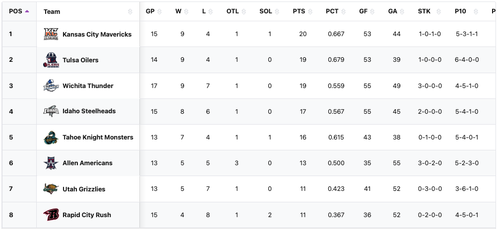 The Tahoe Knight Monsters now have a record of 7-4-2 with 16 points in 13 games. The Knight Monsters are in 15th place in ECHL. They are in 7th place in the ECHL Western Conference. They are in 5th place in the ECHL Western Conference Mountain Division. They are one point from a playoff spot. They are four points away from the top spot in the division. They have the 3rd highest points percentage in the division.