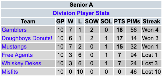| #1 Reno Pond Hockey | 10 | 10 | 0 | 0 | 55 | 26 | +29 | 20 |