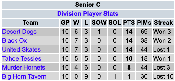 In the RIAL C-League, the United Skates, the Desert Dogs, and the defending champions Black Ox have secured playoff spots. The Tahoe Tessies have advanced to the playoffs. Big Horn Tavern and the Murder Hornets have been eliminated from playoff contention.