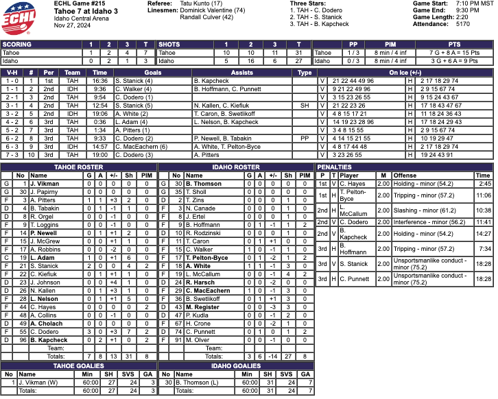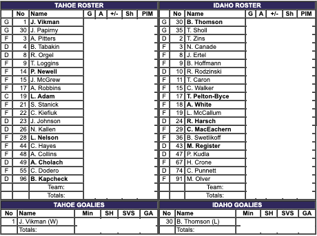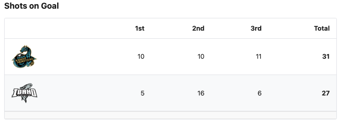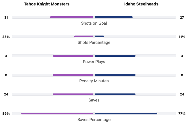 The Tahoe Knight Monsters had four more shots. The Knight Monsters had the better shot percentage. Both teams had eight penalty minutes. #1 Jasper Vikman saved 24 shots for a 89% save percentage in his return for the Knight Monsters. #30 Bryan Thomson saved 24 shots for a 77% save percentage for the Idaho Steelheads.