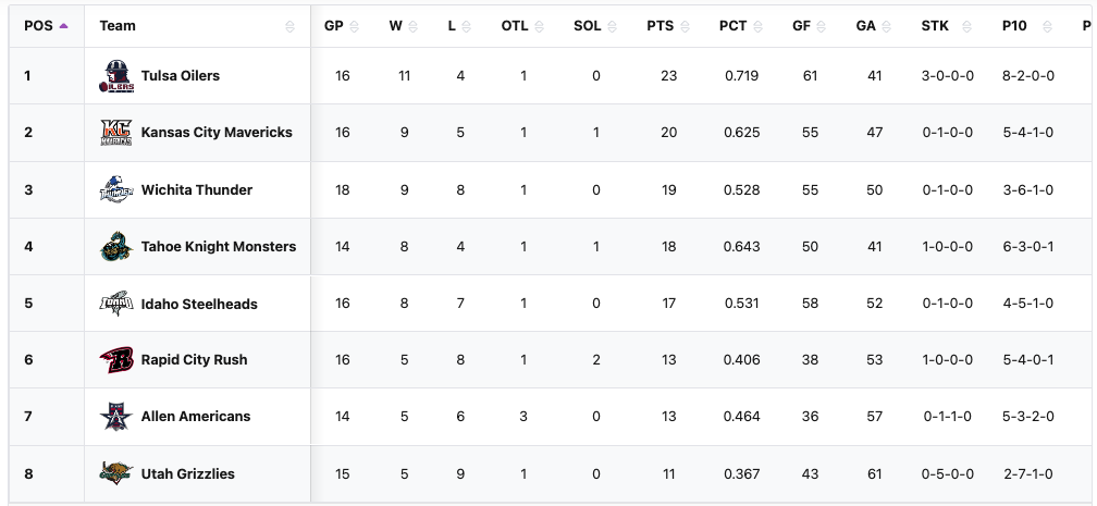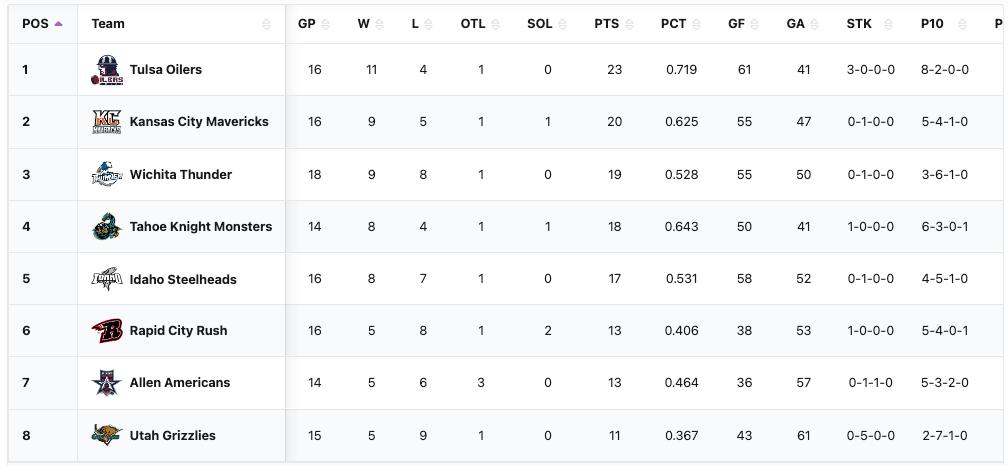 The Tahoe Knight Monsters now have a record of 8-4-2 with 18 points in 14 games. The Knight Monsters are in 13th place in ECHL. They are in 5th place in the ECHL Western Conference. They are in 4th place in the ECHL Western Conference Mountain Division. They are in a playoff spot. By one point. They are five points away from the top spot in the division. They have the 2nd highest points percentage in the division.