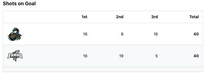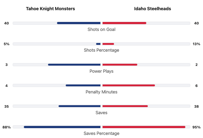 Both teams had forty shots. The Idaho Steelheads had the better shot percentage. The Steelheads had two more penalty minutes. #30 Jordan Papirny saved 35 shots for a 88% save percentage in his return for the Knight Monsters. #30 Tomas Sholl saved 38 shots for a 95% save percentage for the Idaho Steelheads.