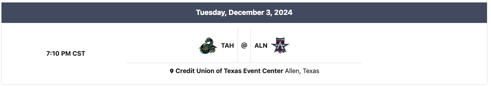 The Tahoe Knight Monsters will take on the Allen Americans for game seventeen on Tuesday, December 3rd. It will be an away game. Puck drop is scheduled for 6:10 PM. This is another divisional game.