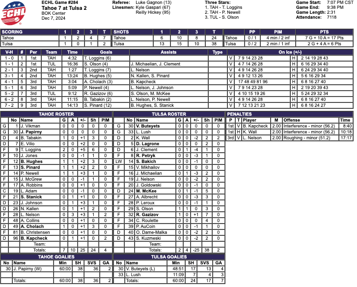 #30 Jordan Papirny was in net for the Tahoe Knight Monsters. This was his eighth start for the Tahoe Knight Monsters this season. On Friday, forward Jett Jones was assigned to the Tahoe Knight Monsters by the Henderson Silver Knights. Forward Anthony Collins, and forward Adam Pitters were placed on reserve by the Tahoe Knight Monsters. Forward C.J. Hayes was moved from 3-day injured reserve to 14-day injured reserve. On Saturday, forward Anthony Collins was activated from reserve by the Knight Monsters. Forward Chris Dodero was placed on reserve by the Knight Monsters. #30 Vyacheslav Buteyets got the start in net for the Tulsa Oilers. It was his twelfth start in net for the Oilers this season. On Thursday, goaltender Talyn Boyko was recalled from the Tulsa Oilers to the Hartford Wolf Pack. On Friday, forward Austin Albrecht was activated by the Oilers. Forward Michael Farren was placed on reserve by the Oilers. On Saturday, goaltender Luke Lush was activated by the Oilers.