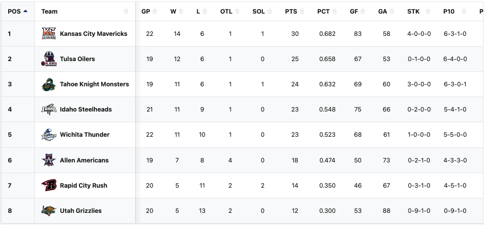 The Tahoe Knight Monsters now have a record of 11-6-2 with 24 points in 19 games. The Knight Monsters are in 11th place in ECHL. They are in 5th place in the ECHL Western Conference. They are in 3rd place in the ECHL Western Conference Mountain Division. They are in a playoff spot. They are six points away from the top spot in the division. They have the 3rd highest points percentage in the division.
