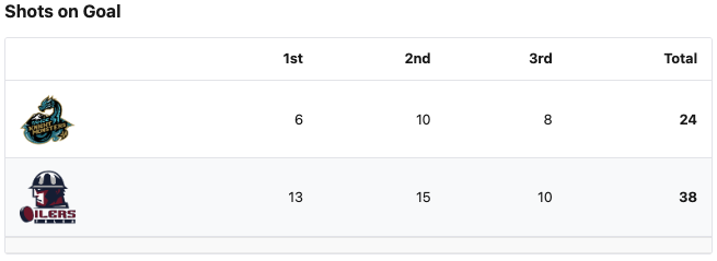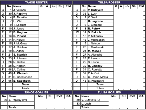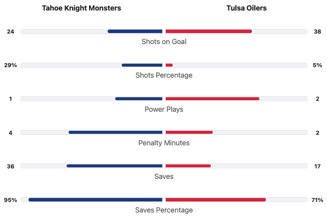 The Tulsa Oilers more fourteen more shots. The Tahoe Knight Monsters had the better shot percentage. The Knight Monsters had two more penalty minutes. #30 Jordan Papirny saved 36 shots for a 95% save percentage for the Tahoe Knight Monsters. #30 Vyacheslav Buteyets saved 13 out of 17 shots for a 76% save percentage for the Oilers. #33 Luke Lush saved 4 out of seven shots for a 57% save percentage for the Oilers. Overall the Oilers had a 71% save percentage and saved 17 shots.