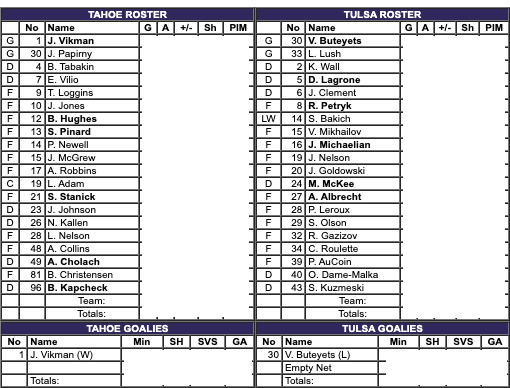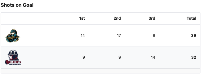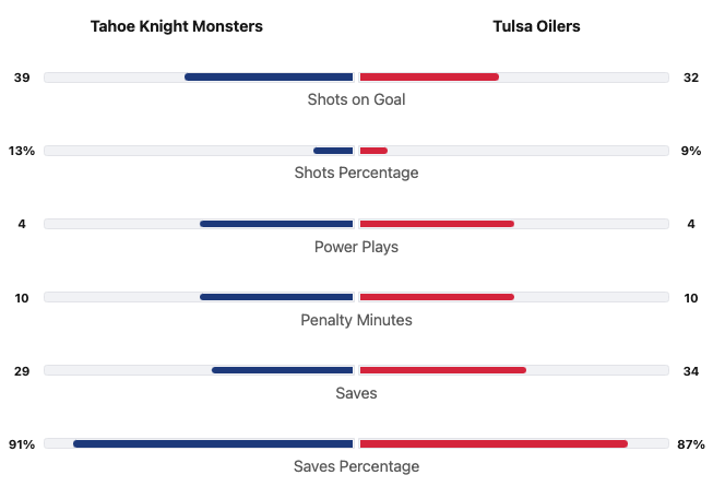 The Knight Monsters had more seven more shots. The Tahoe Knight Monsters had the better shot percentage. Both teams had ten penalty minutes. #1 Jesper Vikman saved 29 shots for a 91% save percentage for the Tahoe Knight Monsters. #30 Vyacheslav Buteyets saved 24 shots for a 87% save percentage for the Oilers.