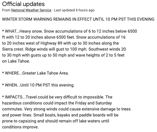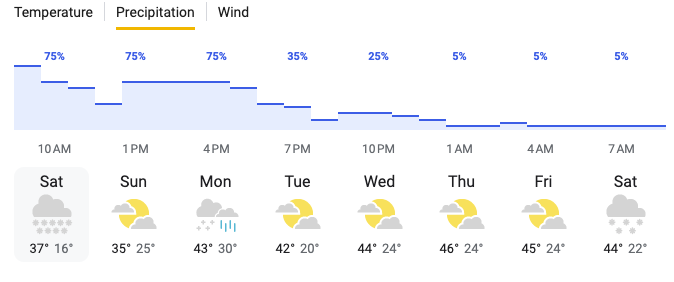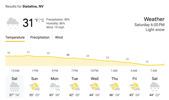 Snow. It did snow during Thursday’s game. The roads were icy after the game. The roads are open now. Their may be chain controls going on. Drive slow. Leave early. There was one car wreck I saw coming back to Reno after the game on Thursday. It will be in around 35° and snowy. There is a winter storm warning in effect.