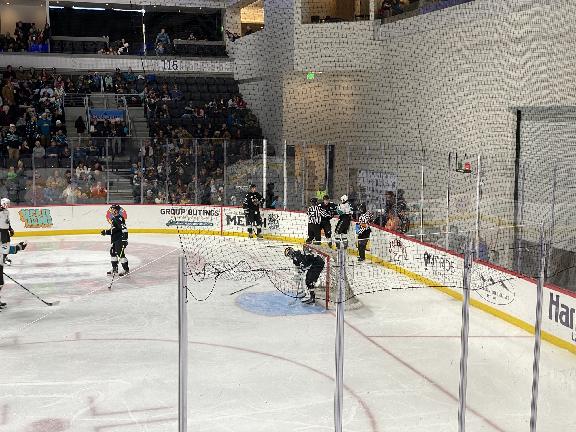 Five minutes into the second period, head coach Alex Loh got into a heated discussion with the official over a no call. Six minutes into the second period, #9 Troy Loggins of the Tahoe Knight Monsters received a penalty for roughing and #8 Keaton Mastrodonato of the Utah Grizzlies received a penalty for roughing. This play was crazy. #4 Branson Tabakin of the Knight Monsters went back to the bench looking injured as the play went from the Knight Monsters end to the Grizzlies end. The Knight Monsters appeared to score. The goal buzzer went off. The ref waved that the shot did not go in. I didn’t see if the red light went off during the play. As the officials blew the play dead, Mastrodonato grabbed Loggins and they went into the corner. Loggins was ambushed and couldn’t do much with his head down but they both got some jabs in there before the linesmen broke it up. ten minutes into the second period, the Tahoe Knight Monsters received a penalty for too many men. On the powerplay the Grizzlies scored to cut the lead back down to two goals. #16 Luke Manning scored the goal. It was assisted by #14 Briley Wood and #6 Andrew Nielsen. The Grizzlies were cycling the puck in the offensive zone. The Knight Monsters were getting back into their defensive positions. Nelson took a shot from the point that went in. This was a case of poor discipline by the Knight Monsters that turned into a goal for the Grizzlies. The Knight Monsters took a bad penalty. The Grizzlies made them pay.