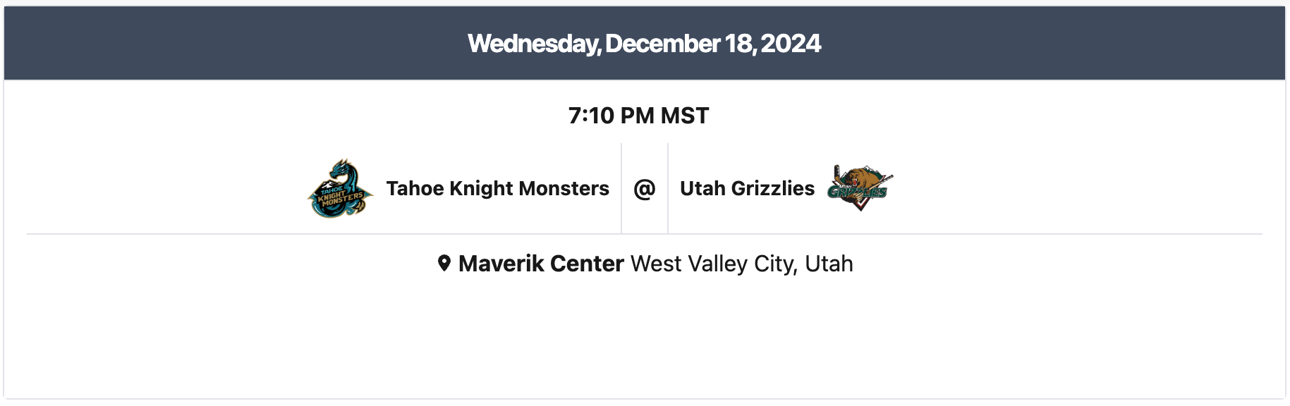 The Tahoe Knight Monsters take on the Utah Grizzlies for game three two on Wednesday, December 18th. It will be an away game. That will be the first of three games in Utah. That will be the fourth of six games where the Tahoe Knight Monsters will play the Utah Grizzlies. Puck drop is scheduled for 6:10 PM. This is another divisional game.