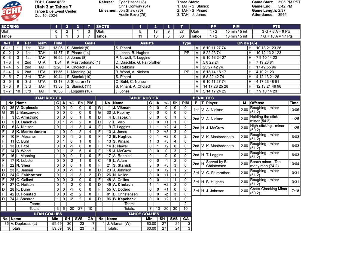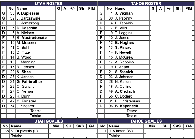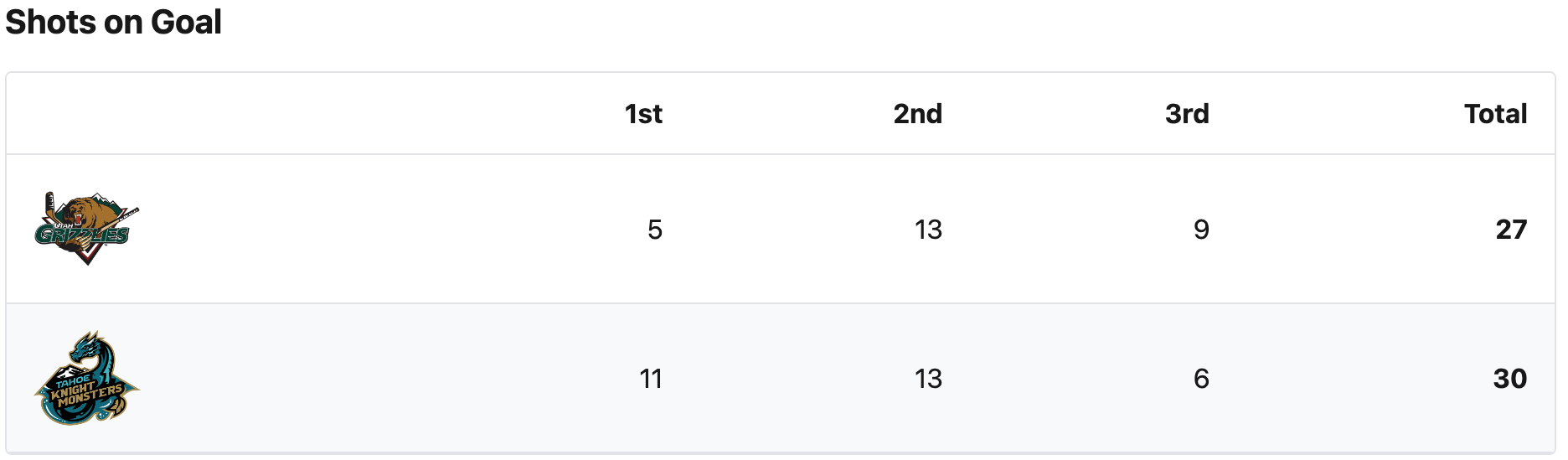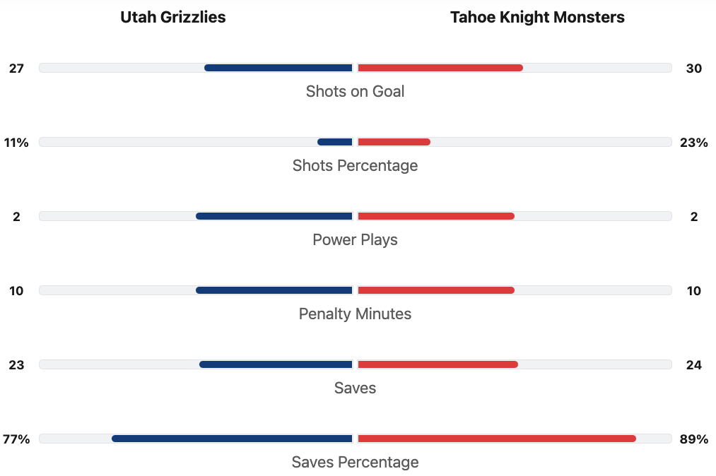 The Knight Monsters had more three more shots. The Tahoe Knight Monsters had the better shot percentage. Both teams had ten penalty minutes. #1 Jesper Vikman saved 24 shots for a 89% save percentage for the Tahoe Knight Monsters. #35 Vinny Duplessis saved 23 shots for an 77% save percentage for the Grizzlies.
