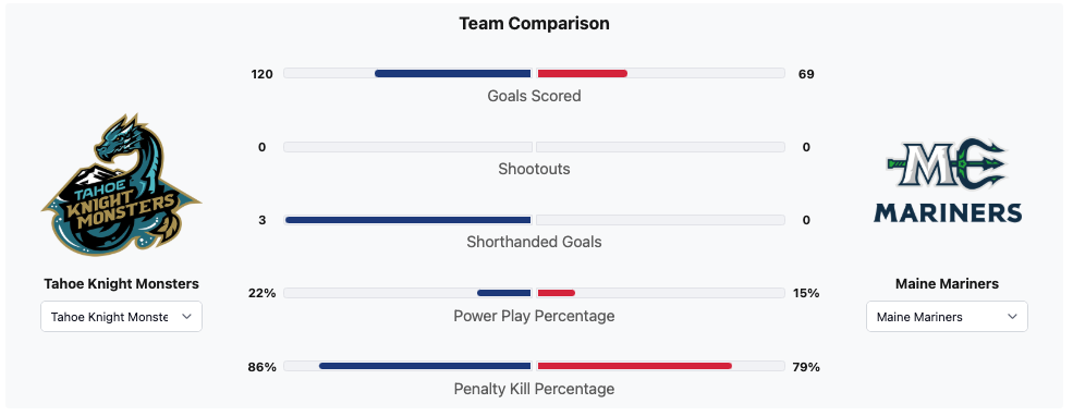 The Tahoe Knight Monsters played three more games. The Knight Monsters had seven more wins. The Knight Monsters had the better points percentage. The Knight Monsters had scored fifty one more goals. The Knight Monsters had allowed seven more goals. The Knight Monsters had the better goal differential. The Knight Monsters had fifteen more points. The Tahoe Knight Monsters had 277 penalty minutes. The Maine Mariners had 352 penalty minutes.