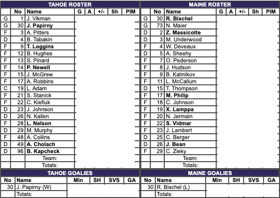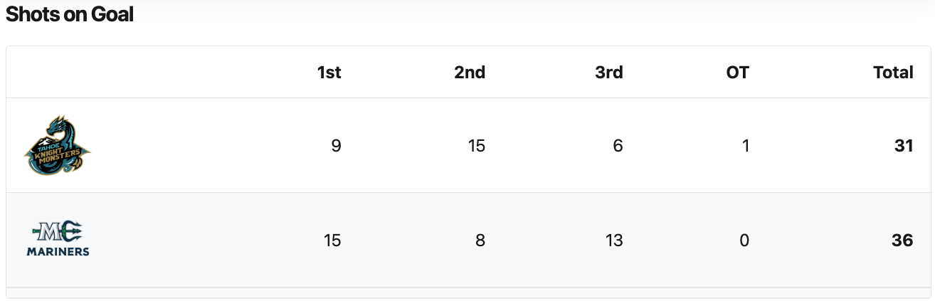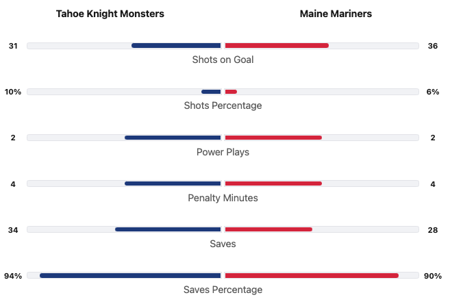 The Maine Mariners had five more shots. The Knight Monsters had the better shot percentage. Both teams had four penalty minutes. #30 Jordan Papirny saved 34 shots for a 94% save percentage for the Tahoe Knight Monsters. #30 Ryan Bischel saved 28 shots for a 90% save percentage for the Maine Mariners.