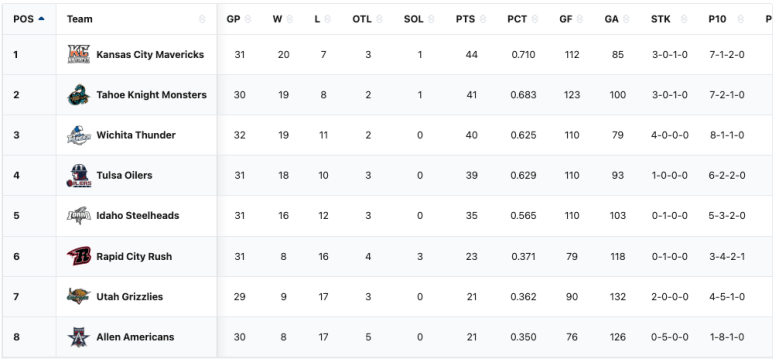 The Tahoe Knight Monsters have a record of 19-8-3 with 41 points in 30 games. The Knight Monsters are in 7th place in ECHL. They are in 3rd place in the ECHL Western Conference. They are in 2nd place in the ECHL Western Conference Mountain Division. They are in a playoff spot. They are six points into a playoff spot. They are three points away from the top spot in the division. They have the second highest points percentage in the division.