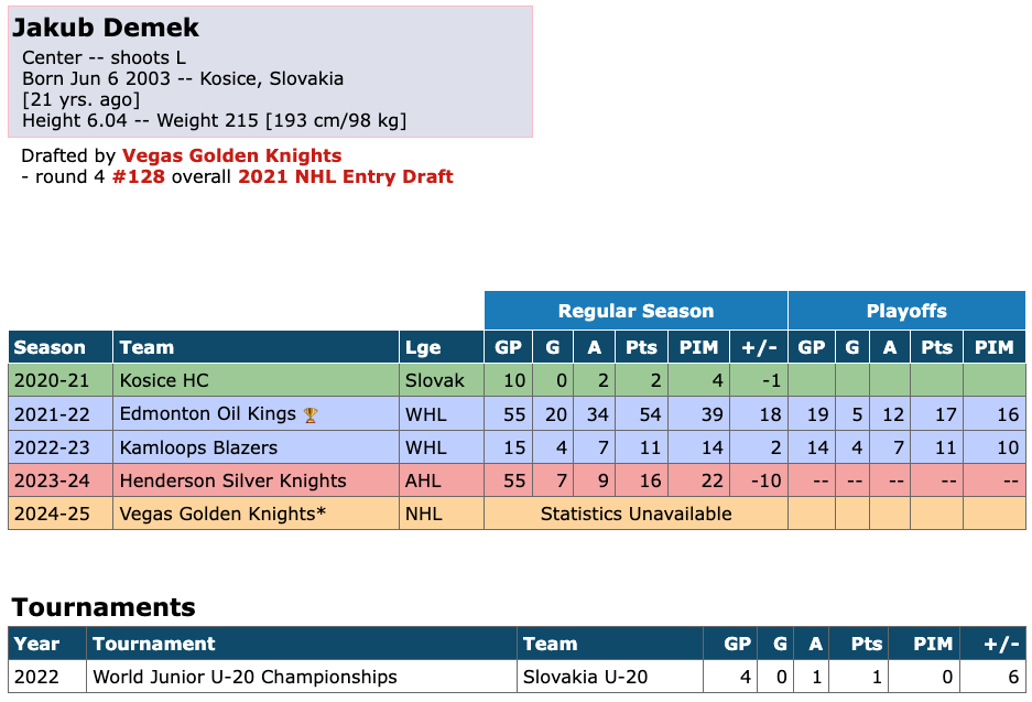 Today the Henderson Silver Knights have assigned forward Jakub Demek to the Tahoe Knight Monsters. Demek was drafted 128th overall by the Vegas Golden Knights in 2021. He was on the Slovakia U-20 team in 2022. He won the Canadian Hockey League Memorial Cup during the 2021-22 season as a member of the Edmonton Oil Kings. Demek is in his second professional season. He spent all of last season with the Henderson Silver Knights. He was injured after playing fifty five games. He appears to have spent most of this season with the Vegas Golden Knights. He has not played a game yet this season. He is likely with the Tahoe Knight Monsters as part of recovery and will likely rejoin the Henderson Silver Knights after a rehab stint. It is also possible that he was moved to the Tahoe Knight Monsters to make space on either the Vegas Golden Knights or Henderson Silver Knights roster. Last season Demek scored seven goals with nine assists for sixteen total points in fifty five games for the Henderson silver Knights. He had twenty two penalty minutes with a +/- of -10.