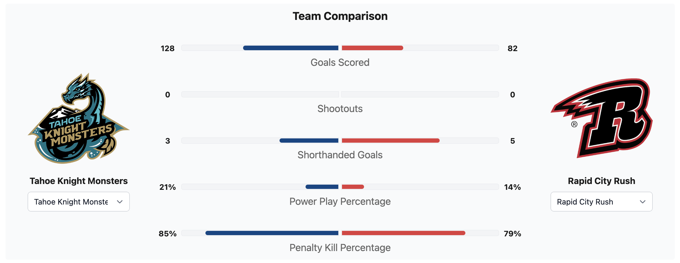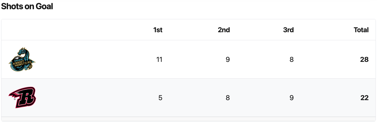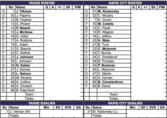 The Tahoe Knight Monsters had six more shots. The Knight Monsters had the better shot percentage. The Rapid City Rush had two more penalty minutes. #1 Jesper Vikman saved 21 shots for a 95% save percentage for the Tahoe Knight Monsters. #31 Matt Radomsky saved 25 shots for a 89% save percentage for the Rapid City Rush.