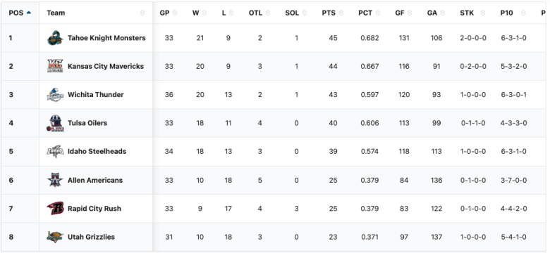 The Tahoe Knight Monsters have a record of 21-9-3 with 45 points in 33 games. The Knight Monsters are in 5th place in ECHL. They are in 2nd place in the ECHL Western Conference. They are in 1st place in the ECHL Western Conference Mountain Division. They are in a playoff spot. They are six points into a playoff spot. They have the highest points percentage in the division. The Knight Monsters are still seven points away from the top spot in the ECHL and the top spot in the ECHL Western Conference.