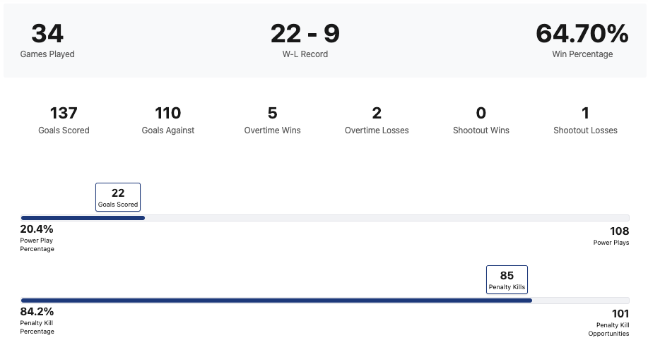 | Tahoe Knight Monsters | 34 | 22 | 9 | 3 | 137 | 110 | +27 | 47 |