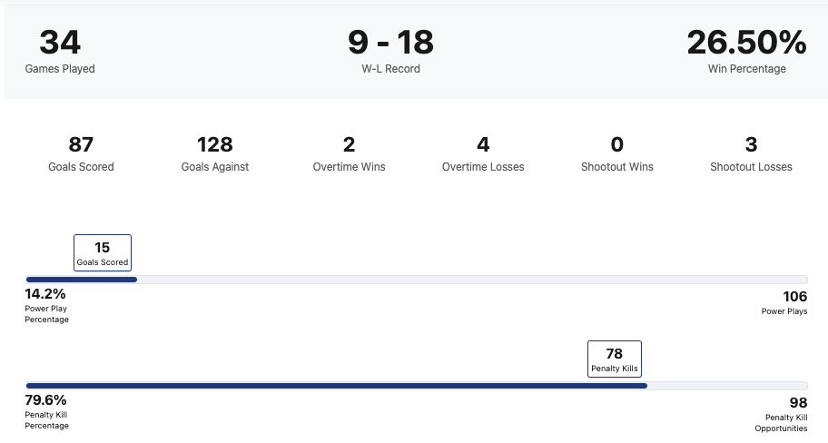 The Rapid City Rush have allowed 128 goals so far this season. That is 3.76 goals per game. They have allowed the 3rd most goals allowed in the ECHL. They have a goal differential of -41.