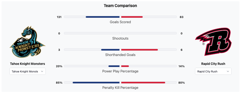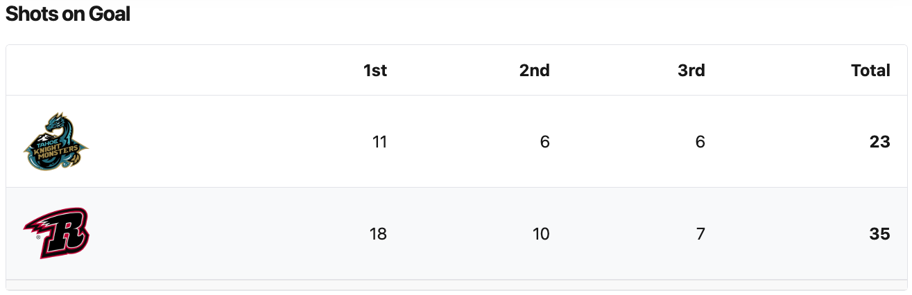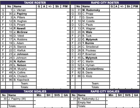 The Rapid City Rush had twelve more shots. The Knight Monsters had the better shot percentage. The Rapid City Rush had two more penalty minutes. #30 Jordan Papirny saved 31 shots for a 89% save percentage for the Tahoe Knight Monsters. #31 Matt Radomsky saved 17 shots for a 74% save percentage for the Rapid City Rush.