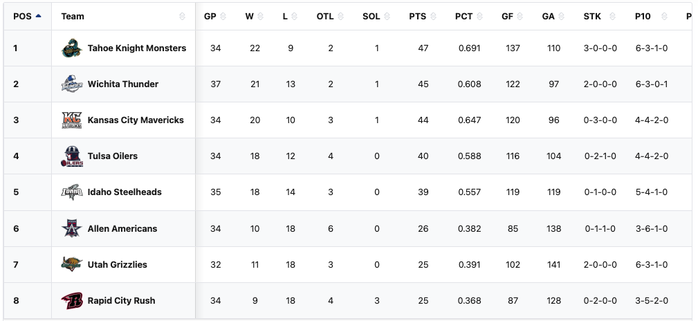 The Tahoe Knight Monsters have a record of 22-9-3 with 47 points in 34 games. The Knight Monsters are in 5th place in ECHL. They are in 2nd place in the ECHL Western Conference. They are in 1st place in the ECHL Western Conference Mountain Division. They are in a playoff spot. They are eight points into a playoff spot. They have the highest points percentage in the division. The Knight Monsters are five points away from the top spot in the ECHL and the top spot in the ECHL Western Conference.